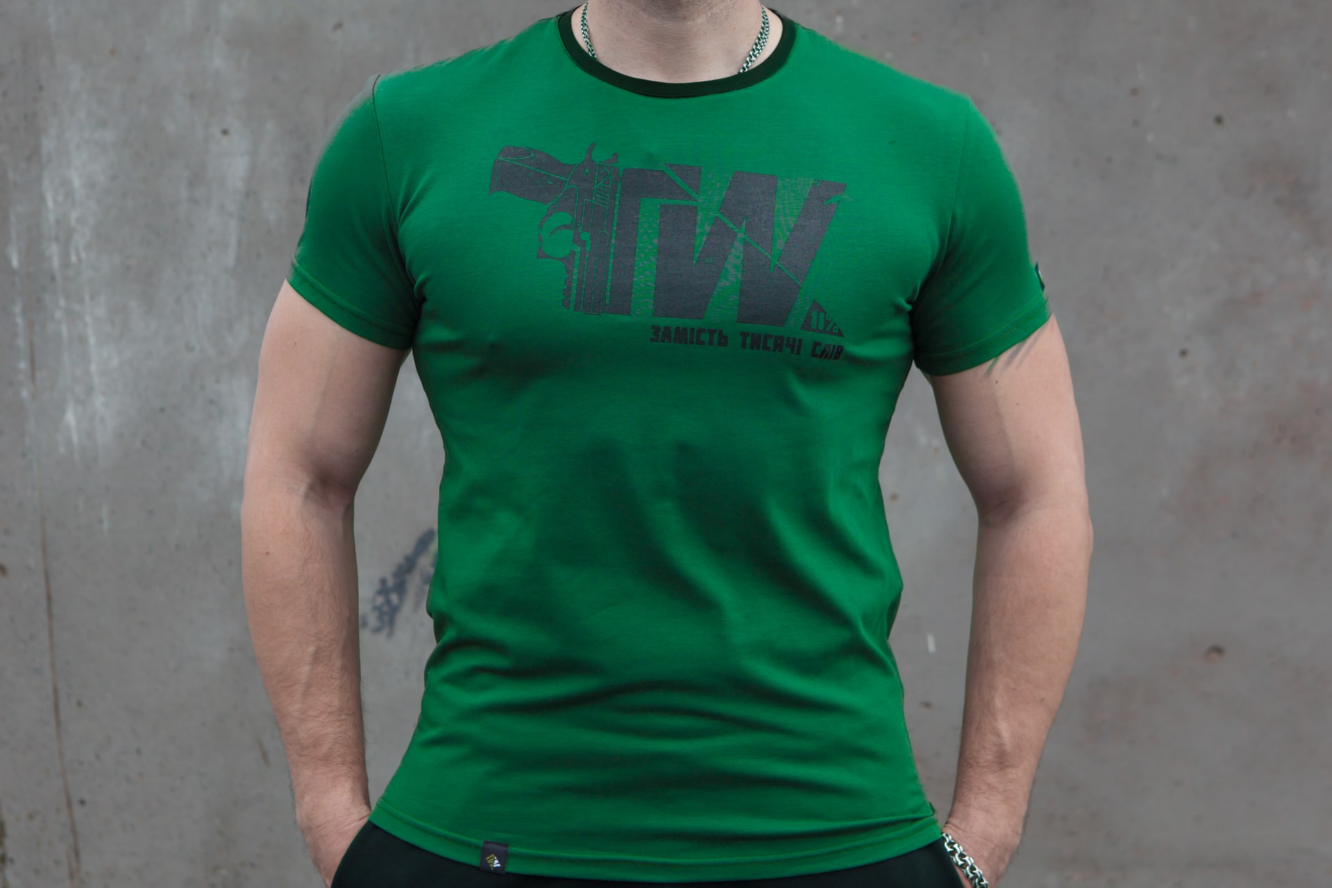 У композиції використано логотип ҐWear і пістолет Форт-17 — зброю українського виробництва, яка стала символом реального спротиву. Принт нагадує: володіння зброєю — необхідність, яку ми усвідомили надто дорогою ціною.