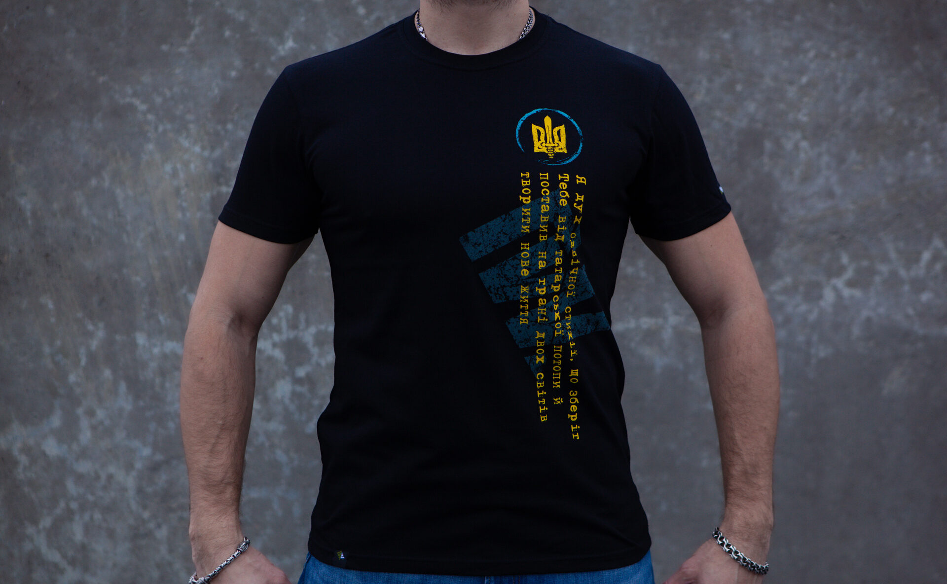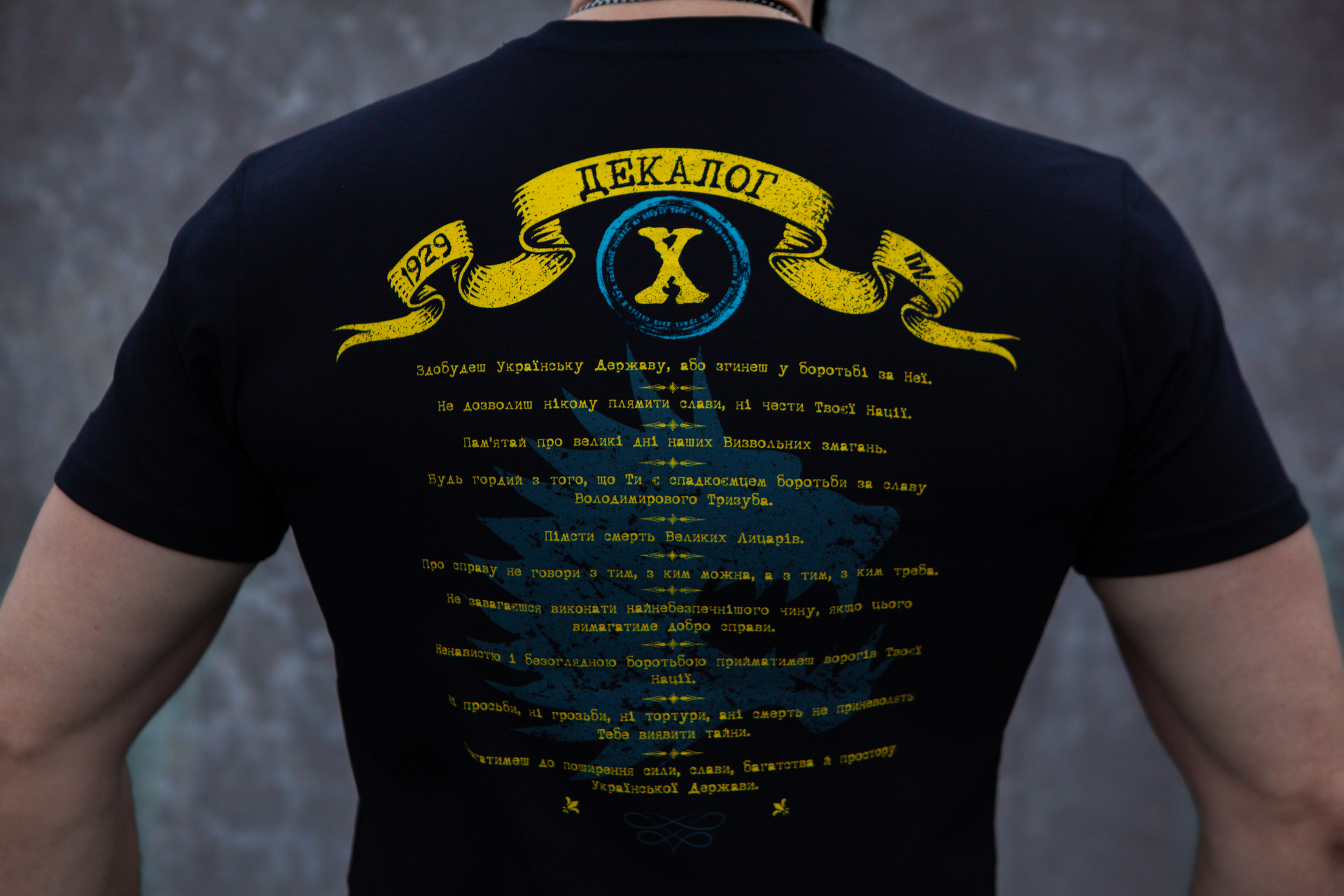 Це, мабуть, єдина у своєму роді футболка, на якій повністю зафіксовано текст Декалогу українського націоналіста — ідеологічного маніфесту, написаного Степаном Ленкавським та ухваленого ОУН у 1929 році.