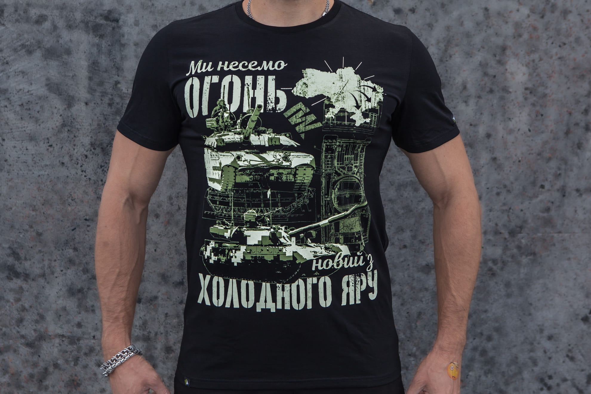 У дизайні футболки використано зображення самохідної артилерійської установки 2С1 «Гвоздика» та інтерпретацію рядків із вірша Тараса Шевченка «Холодний яр»: